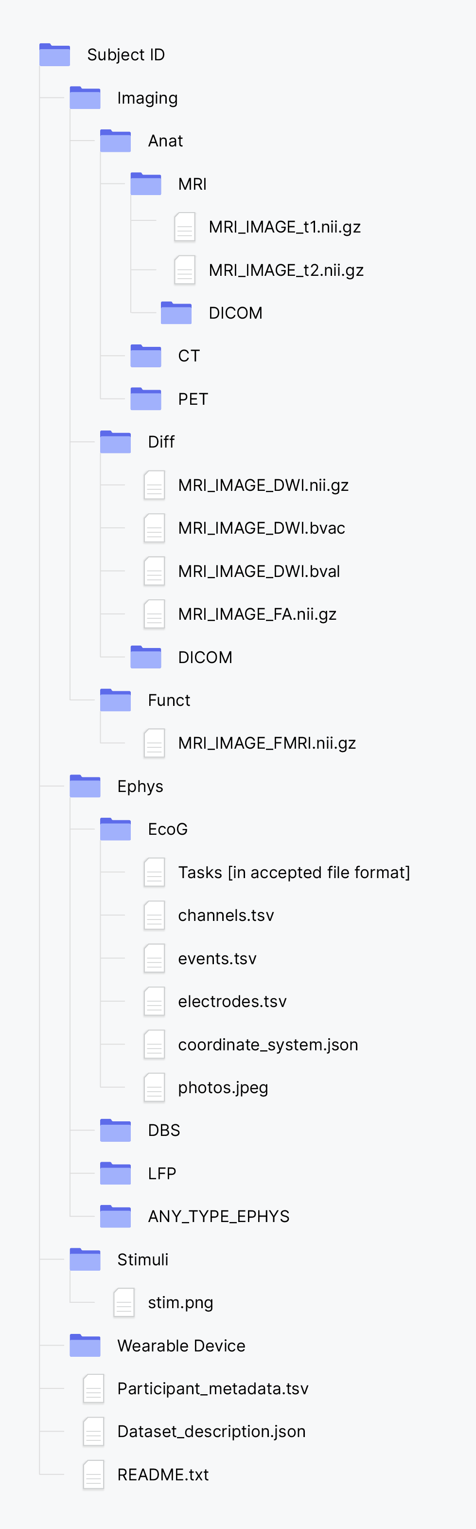 All neuroelectrophysiology data are accepted. We recommend using the BIDS and NWB standards. We also welcome files organized by subject, with signal files in BioSemi, BrainVision, European Data Format, EEGLAB, Blackrock NeuroPort, Intan, and MATLAB formats. Other types of data we accept include imaging files (MRI, fMRI, DWI, CT, PET) in DICOM or NIfTI formats. Additionally, we accept code files, behavioral test scores, patient seizure diaries, wearable device data, surgical photographs, surgical notes, diagrams, and associated publications. We urge our data providers to ensure metadata completeness and include file descriptors.